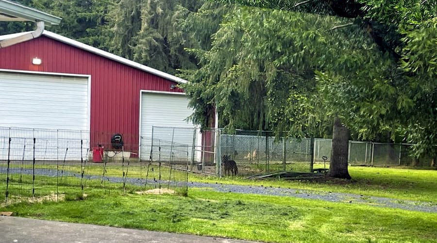 My home is centered around my dogs and providing them the maximum freedom to run and play. My property is completely fenced, there are forested and open areas for my adult dogs and safe, monitored play areas for the puppies. The kennel building includes indoor / outdoor runs. The interior runs are 6’x14′ and bedded down heavily with fir shavings. My dogs do not sleep on cold, hard cement! The dog doors go outside to 6’x40′ runs that are covered in 3/4″ horse mats to protect their feet running on pavement. All dogs are rotated between large play areas daily.