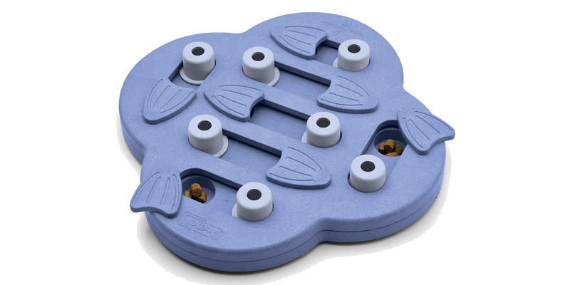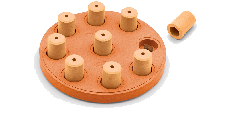 The third level of difficulty in Nina Ottosson’s interactive treat puzzles adds a center spinning disk that your dog has to learn to paw and turn to retrieve the enclosed treats in addition to the sliding pegs and covers around the exterior. Dogs must be actively monitored with this toy just like the easier versions.