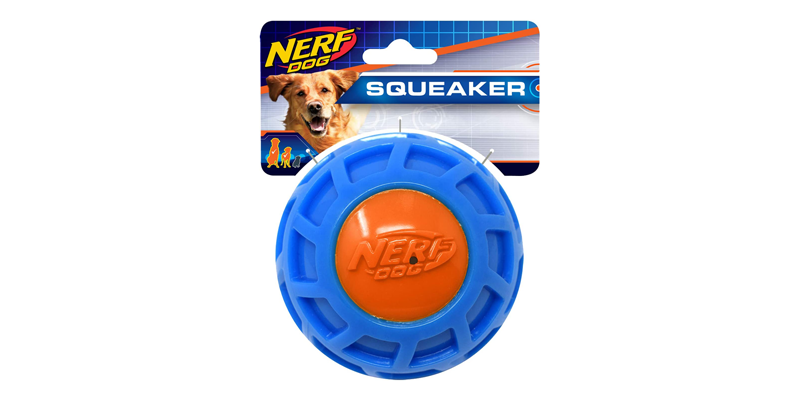 There are infinite numbers of dog balls out there but this one by Nerf has been a robust favorite. It’s on the larger side, so younger puppies might push and chase. It will take one perhaps 3-4 months of age to pick it up. It has a heavy chomp to make it squeak so only an older pup will manage that. All of them like the irregular surface of the ball.