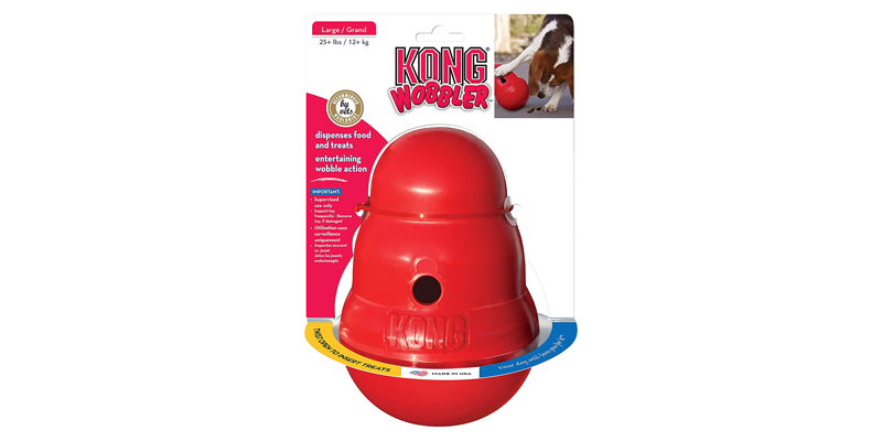 This is a great way to feed and entertain your pup and it is loved by puppies and adult dogs alike. The large is good for an adult dog. The heavy bottom of the toy makes it stay upright as your dog bats it around to get kibble / treats out.