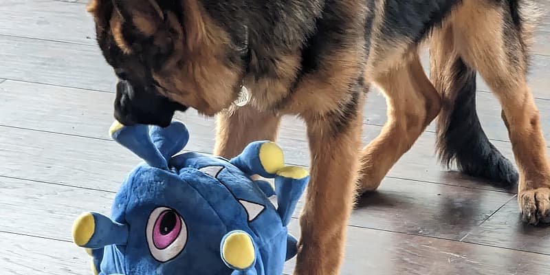 My recommended toys are age-appropriate. For example, young puppies enjoy soft stuffed animals but older dogs may simply shred them. The transition for German Shepherd Dogs from puppy toys to more rugged adult toys happens around four months of age. You’ll know. Your pup will be getting bigger and stronger. They’re more able to and interested in tearing toys up. I’ve labeled the toys PUPPY, OLDER/ADULT or ALL, but as always monitor your dog with whatever toys you give them and use your good judgement.